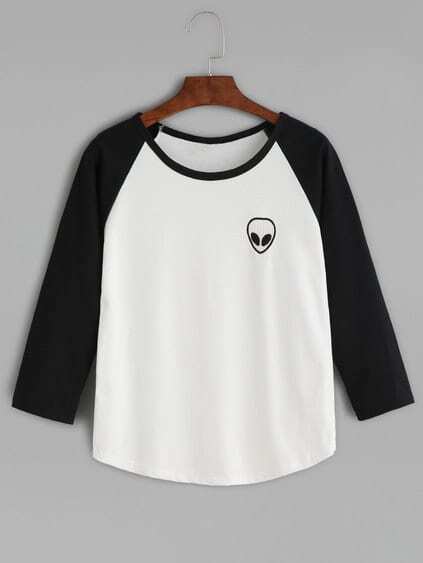 Black Alien Print Raglan Sleeve Curved Hem T-shirt $7.99