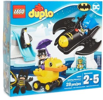 Help Batman use the Batwing to retrieve the stolen treasure back from The Penguin! Jump into a fun LEGO DUPLO experience with the Batwing Adventure play set, and help Batman retrieve the stolen treasure from The Penguin. Includes a duck vehicle, penguin and two DUPLO figures. Your child will love building this fun LEGO DUPLO Batwing Adventure play set and helping Batman retrieve the stolen treasure. Theres lots of action in this set for your little super hero: start the story off by launching the Batwing ́s cannon, then push The Penguin down the slide before he escapes in his duck vehicle. Includes two DUPLO figures. Includes two LEGO DUPLO figures: Batman and The Penguin, plus a penguin figure.